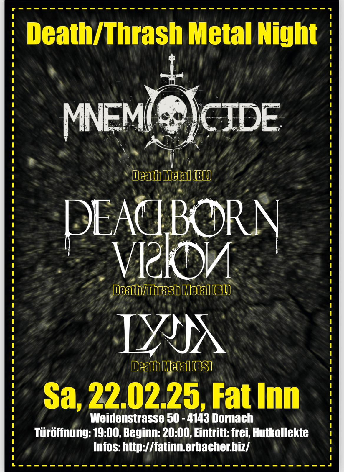 Just a stone’s throw away from our rehearsal room, we will be transforming the Fat Inn in Dornach into a death/thrash temple – together with our friends from DEADBORN VISION and LYSSA on February 22nd 2025. A home game for all of us!